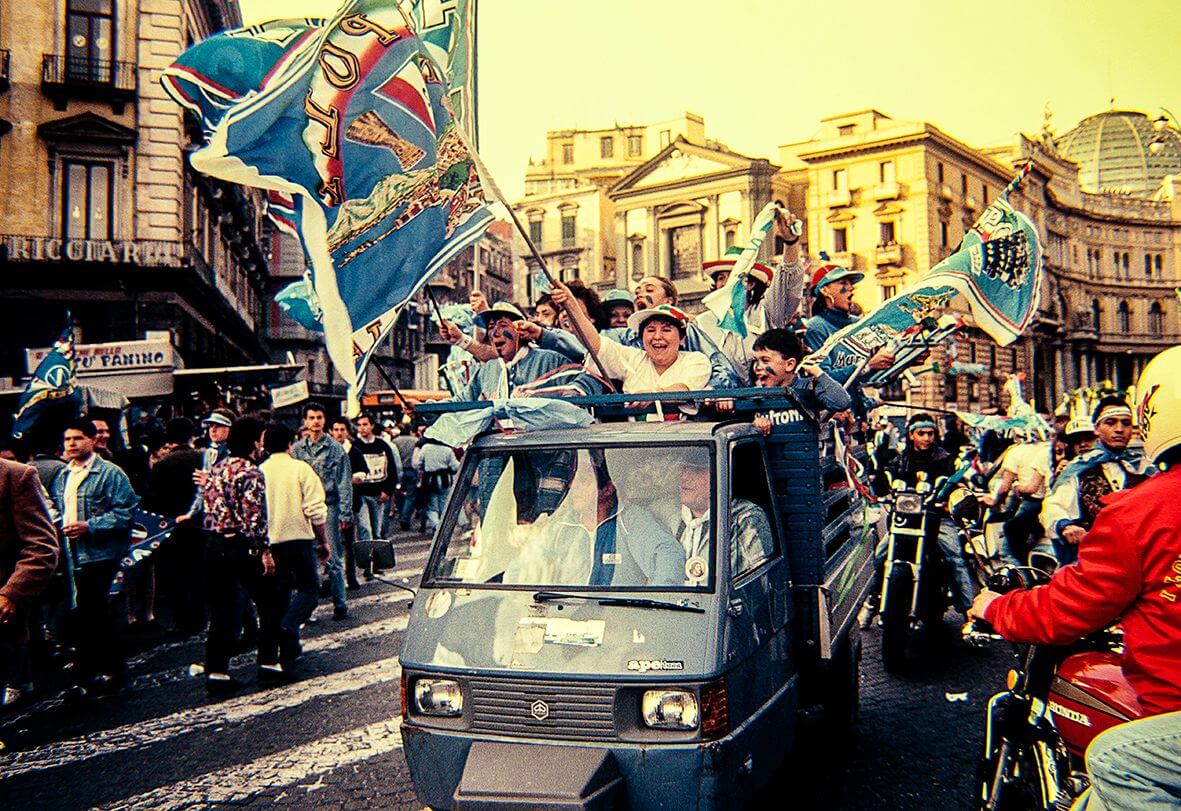 Ero già in strada già da un po’ di tempo, in una città deserta come mai. Giunsi alla Stazione Centrale delle FS in Piazza Garibaldi a metà del primo tempo della partita e qui ebbi un primo assaggio di cosa stava accadendo: Sui maxi schermi, normalmente usati per la pubblicità, la Rai trasmetteva la diretta della partita del S. Paolo. Una marea umana osservava la partita occupando in ogni angolo, ogni punto della stazione da cui era possibile guardare la partita. Dalla Stazione proseguii verso C.so Umberto. Ancora oggi ricordo distintamente il silenzio irreale di tanto in tanto interrotto da qualche urlo, proveniente dalle finestre aperte delle abitazioni. Dai bassi di Spaccanapoli e Forcella si intravedevano famiglie intere appiccicate alle TV e alle radioline che trasmettono la radiocronaca della partita. Una famiglia mi vide e mi fece segno di entrare per condividere con loro quei momenti come se fossimo dei vecchi amici. Il tempo di qualche istantanea, un caffè e proseguii il mio cammino in una città deserta. In una Piazzetta dei quartieri spagnoli, normalmente super affollata ma per l’occasione occupata da un gruppo di ragazzini intenti a giocare a pallone mentre una radiolina poggiata su a terra trasmetteva la partita. A Forcella in uno slargo altri ragazzini giocavano su un palchetto che, di lì a poco, avrebbe ospitato cantanti e ballerine.